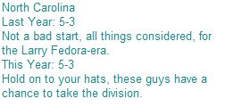 A few notes. Pitt clearly got the short end of the stick in terms of division allignment. While the Panthers rank seventh in estimated 2013 SRS, they rank just fifth in their division. Meanwhile, Syracuse ranks ninth in estimated SRS, but is a slightly healthier fourth in their division. As I stated earlier, most of these ratings seem plausible. I'll quibbled with Maryland ranking last (that honor should probably belong to Duke), but these numbers seem to pass the eye test.